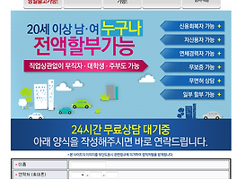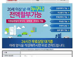 위에 사진을 클릭하시면 상담양식 사이트로 이동합니다. 24시간 상담 대기중. 전화 한통화로 할부 가능여부를 10분이내로 알아보신후 간단한 서류 준비만으로 자동차 당일출고 가능합니다. 수입자동차 외에도 국산차 할부 진행 가능. (전 차종 할부 진행 가능합니다 벤츠 GLK클레스 중고 할부 이자.) 신차, 중고자동차, 국산차, 외제차, 화물차량, 트럭 등 전 차종 할부 진행 가능. 벤츠 GLK클래스 중고 할부 이자 현금 한푼 없이 자동차 구매 20세 이상이면 누구나 가능.벤츠 GLK클래스 중고 할부 이자 직업과 소득이 없어도 할부 진행 가능. (직장인, 사업자, 주부, 프리랜서, 공무원, 대학생, 무직자 등... 벤츠 GLK클래스 중고 할부 이자저신용자, 무면허자, 통신연체자 등 할부 진행 가능) 자동차 할부..